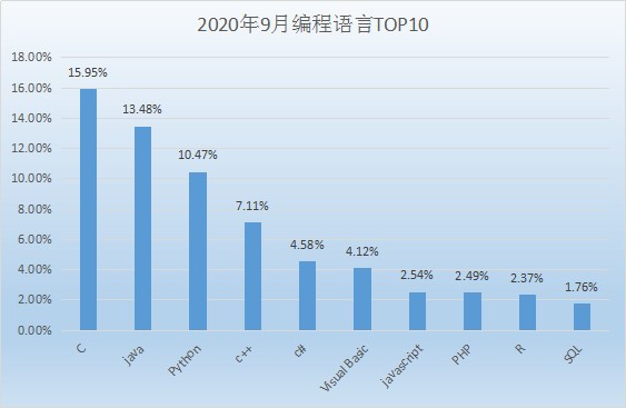 可能上图的排行不够直观,下面看看2020年9月编程语言排行榜top10的柱状图