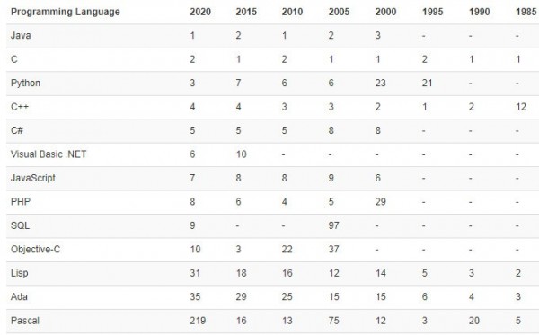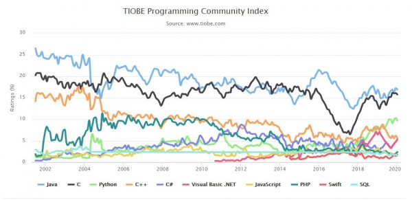 前十名编程语言长期走势图(2002-2020):