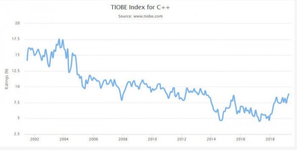 2003 年是 C++ 的高光时刻:当年 8 月它达到了占比 17.53% 的高点,位列 top 3 编程语言,并获得当年的 TIOBE 编程语言奖。但之后 C++ 开始走下坡路。2005 年以后,它的占比甚至再没超过 10%,2017 年 C++ 出现了历史最低记录 4.55%。但是,今年 9 月的排行榜单显示,C++ 达到 7.11% 的份额,年增长率高达 1.48%,成为增长最快的编程语言。