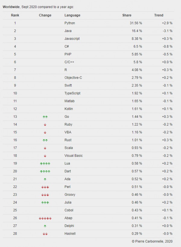 PYPL编程语言排行榜2020年9月: