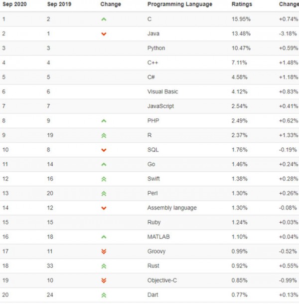 2020年9月编程语言排行榜TOP20: