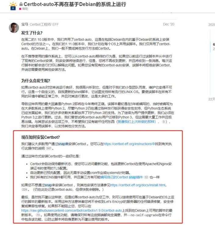 起因是官方从1.9.0版本在所有基于Debian或RHEL的系统上,certbot-auto开始弃用,原因是certbot-auto是基于python2编写的,python 2去年已经GG,certbot团队又懒得移植到python3(我胡说的),具体看下面官方解释