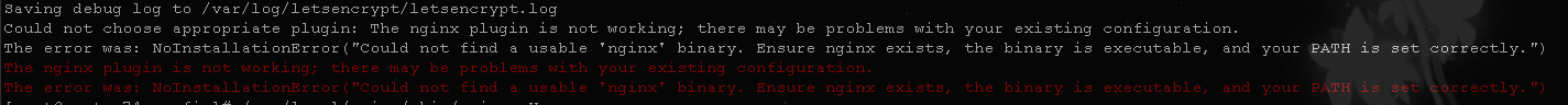 Saving debug log to /var/log/letsencrypt/letsencrypt.log Could not choose appropriate plugin: The nginx plugin is not working; there may be problems with your existing configuration. The error was: NoInstallationError("Could not find a usable 'nginx' binary. Ensure nginx exists, the binary is executable, and your PATH is set correctly.")