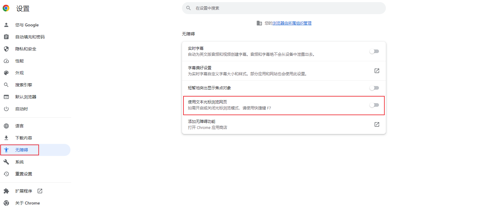 出现这种情况的原因因为大概是用户无意中打开了浏览器无障碍模式中的使用文本光标浏览网页的功能。对于Chrome浏览器而言就是这样的: