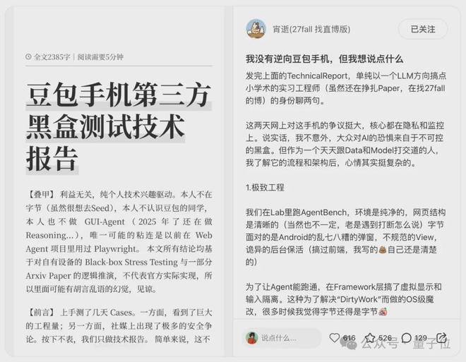 例如小红书博主@宵逝(27fall 找直博版),他在测试完豆包手机助手后,写了一篇长达2385字的分析。