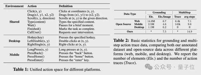 2)设计跨平台统一动作空间,整合标注轨迹与开源数据提升动作定位准确性。