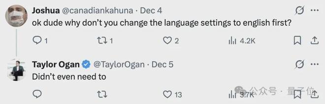有人看他的手机界面,问他“为啥不先把语言设置改成英语”,Taylor Ogan回应“甚至都不需要”。