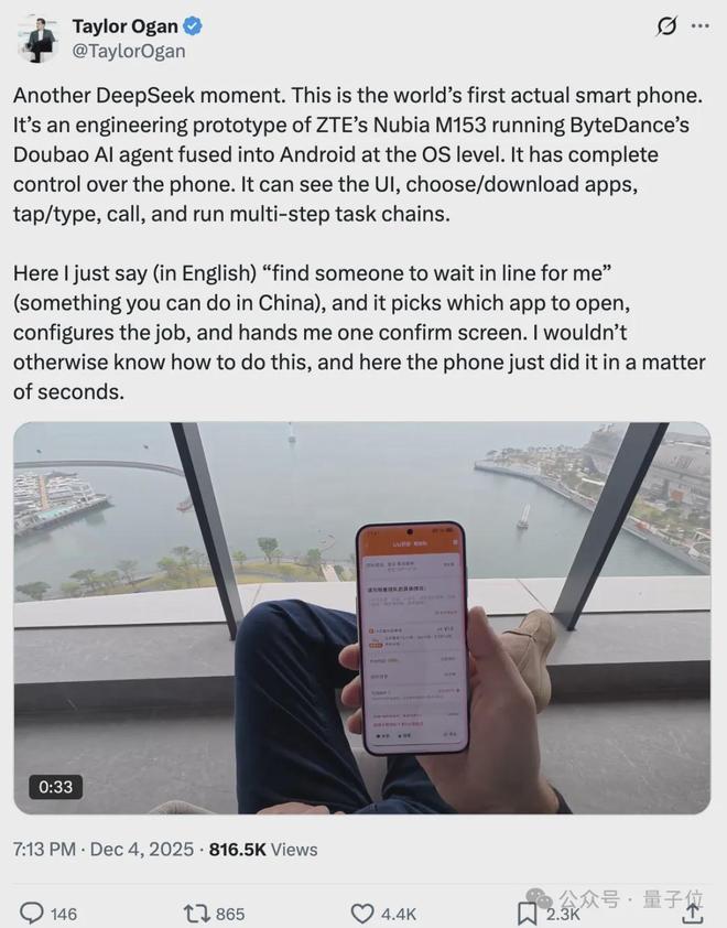 在华创业者Taylor Ogan拿到了手机后,就在上连发帖子,给出的评价那是相当的高(发出宋丹丹的声音),称其为“又一次DeepSeek时刻,这是全球第一部真正的AI智能手机”。