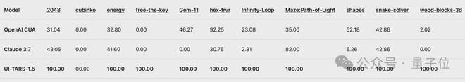他们从poki.com挑选14款游戏进行测试,通过标准化评分,UI-TARS-1.5在与OpenAI CUA、Claude 3.7的对决中胜出。