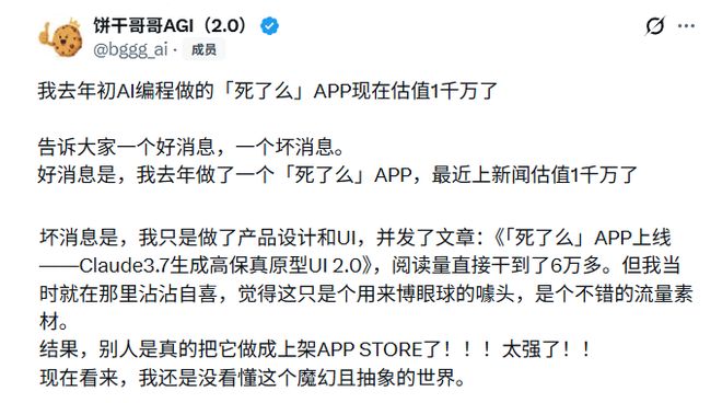 死了么App爆火之后,一位叫饼干哥哥的网友,笑称“自己错失了1个亿”, 去年初,他曾经在网上发了一个教学帖,里面的内容是,用AI快速生成一个程序。