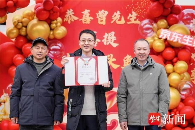 1月18日,京东生鲜将这条来自近2000公里外的查干湖好运“头鱼”亲自送给曾先生,并为其赠予“价值169万头鱼获得者”证书。第一次看到这么大的胖头鱼,曾先生笑着说,“没想到这么大!”