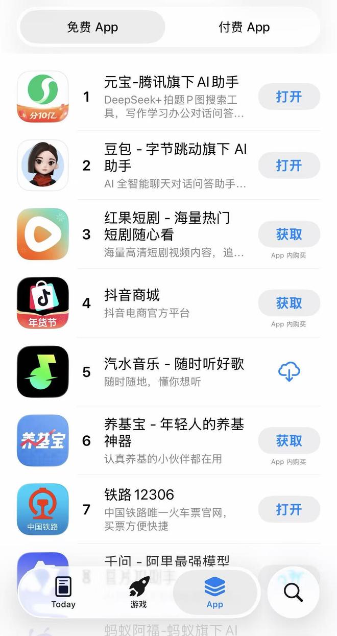 今日元宝红包刷屏,三言发现元宝App冲到苹果应用商店免费榜第1,超过了长期霸榜的豆包。目前,免费榜前10中有4个是AI助手,另外两个分别为千问(第8)、蚂蚁阿福(第9)。