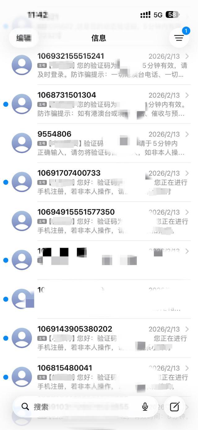 但让黄女士没想到的是,2月13日凌晨,她的手机便陆续收到了大量短信骚扰,内容为各种账号注册和信贷验证。