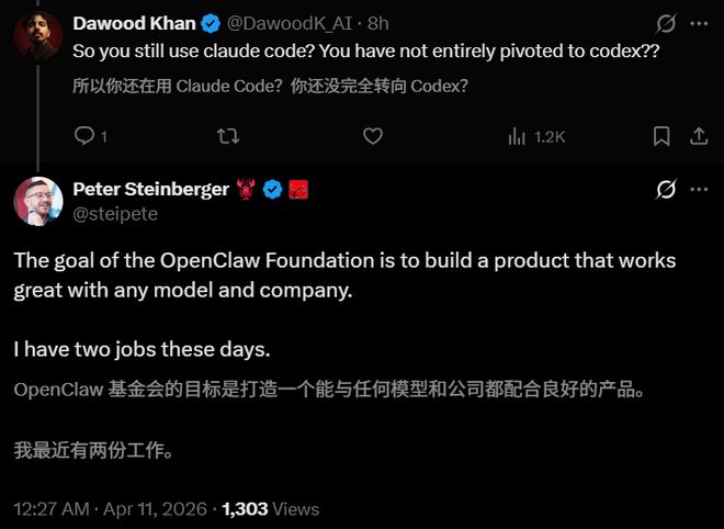 你得分清楚两件事。我在OpenClaw基金会的工作,是让OpenClaw可以很好地配合任何一个模型提供商。我在OpenAI的本职工作,是帮他们想清楚未来的产品策略。