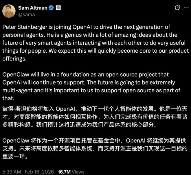 奥特曼对Steinberger的回应则是公开称他为「一个有无数好点子的天才」,把OpenClaw移交给独立的开源基金会,承诺持续支持,让他来「推动下一代个人agent」。