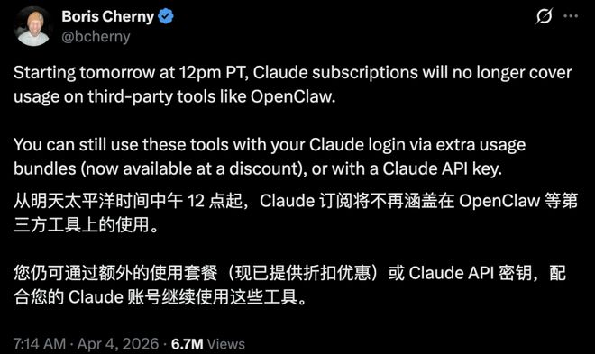 明天中午12点(太平洋时间)起,Claude订阅将不再覆盖OpenClaw等第三方工具的使用。