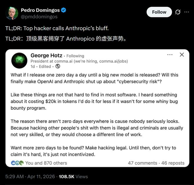这位曾凭借一人之力破解iPhone和PS3的黑客奇才在社交媒体上公开放话,直指 Anthropic在吹牛。