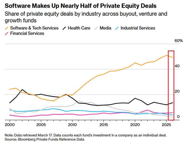 数据显示,美国私募股权交易中,49%都瞄准了软件和技术服务公司——这是近15年来最高的比例,比排名第二的医疗行业(14%)高出了三倍多。